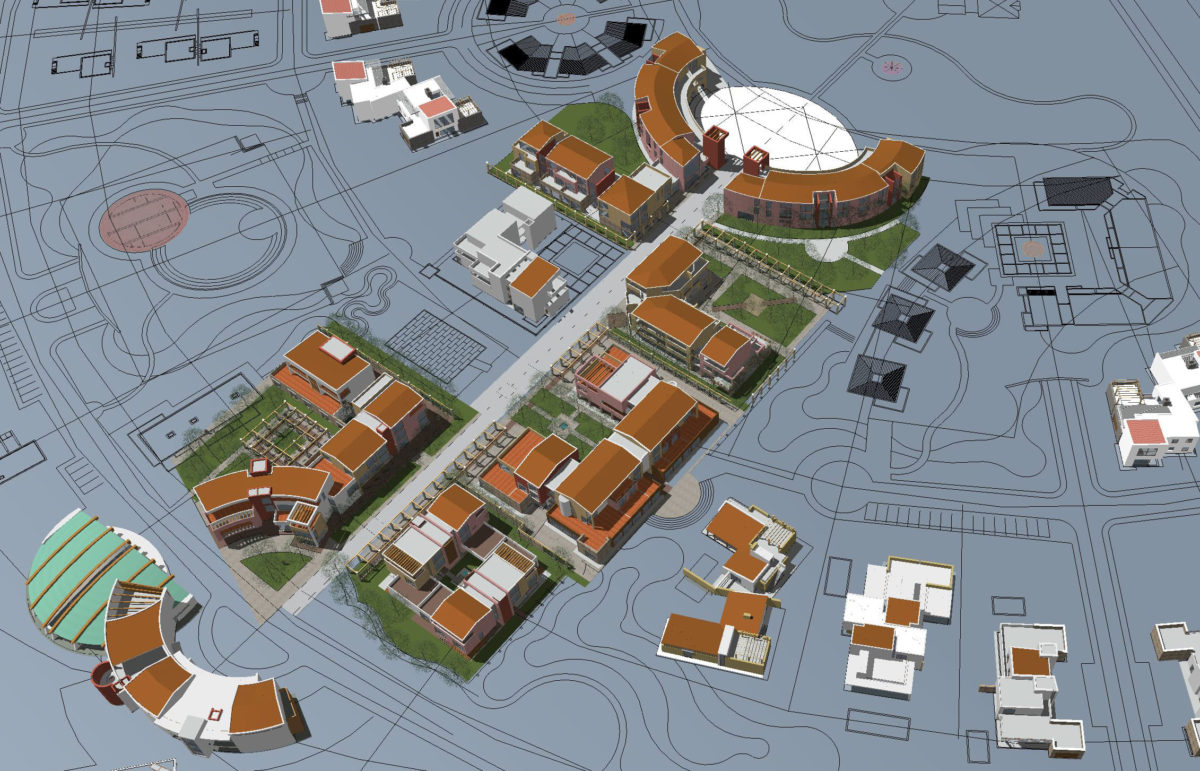 The project structure of the area carries evocatively to Argentina the plan and typology of Italian villages. Against a more traditional design of the surrounding areas inside the compendium, designed at individual lots with a small house for each one, the project, through the axial composition and the subsequent decomposition of paths, reminds of an Italian village, characterized by the differentiation of the alignments and the presence of squares and spaces.