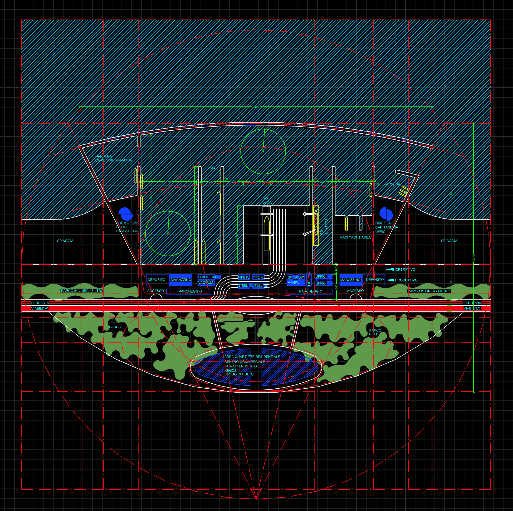 – a band dedicated to vehicular and rail infrastructures, adequately far and shielded from the residential area, directly related to the production area;