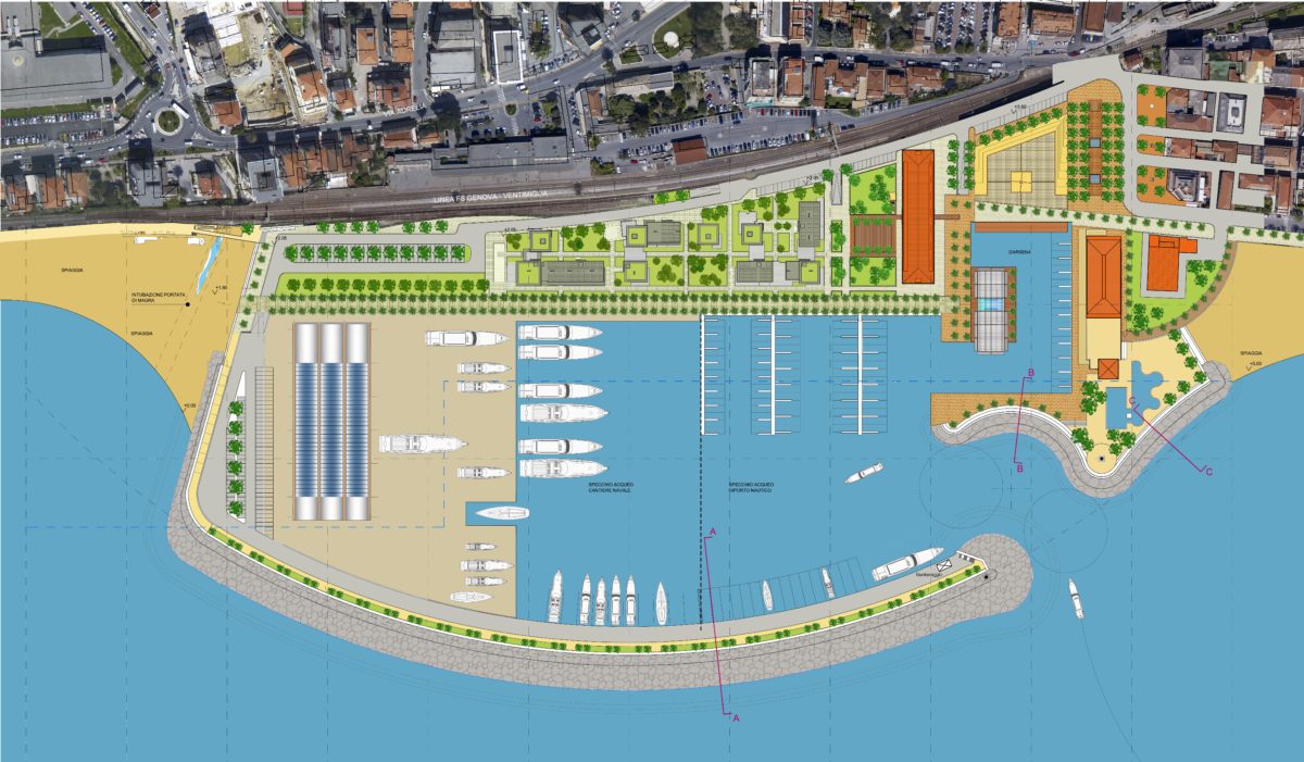 The objective of the project is the transformation of the area according to the reorganization of established shipbuilding activities, the territorial redevelopment of the site, its integration with the surrounding urban fabric, the construction of a new marina and the development of the tourist vocations of Pietra Ligure. The project includes the following functions: new residential buildings (13,000 sq. m.) and restored residential buildings (4,900 sq. m.) , shipyard (7,200 sq. m.) with a proper large square, a hotel (5,400 sq. m. – 60 rooms), public places (900 sq. m. – restaurants, bars), a marina (ca. 120 b.), a public park and walking trails reconnected with the surrounding urban environment.