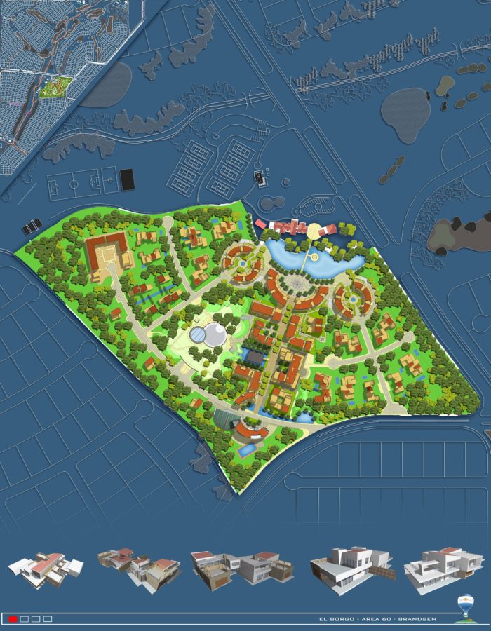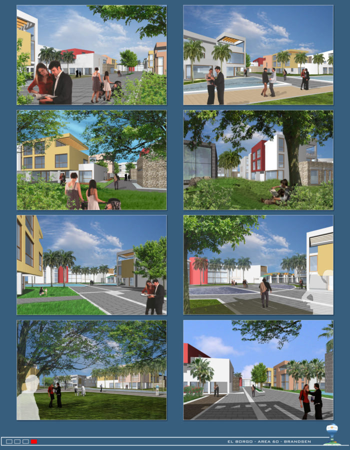 L’assetto progettuale dell’area trasporta evocativamente in terra argentina la citazione planimetrica e tipologica dei borghi italiani. A fronte infatti di una più tradizionale progettazione delle aree limitrofe interne al compendio, pensata a singoli lotti con una villetta per ciascuno, il progetto, tramite la composizione assiale e la successiva scomposizione ragionata dei percorsi cita un borgo italiano, caratterizzato dalla differenziazione degli allineamenti e dalla presenza a sorpresa di piazze e spazi.