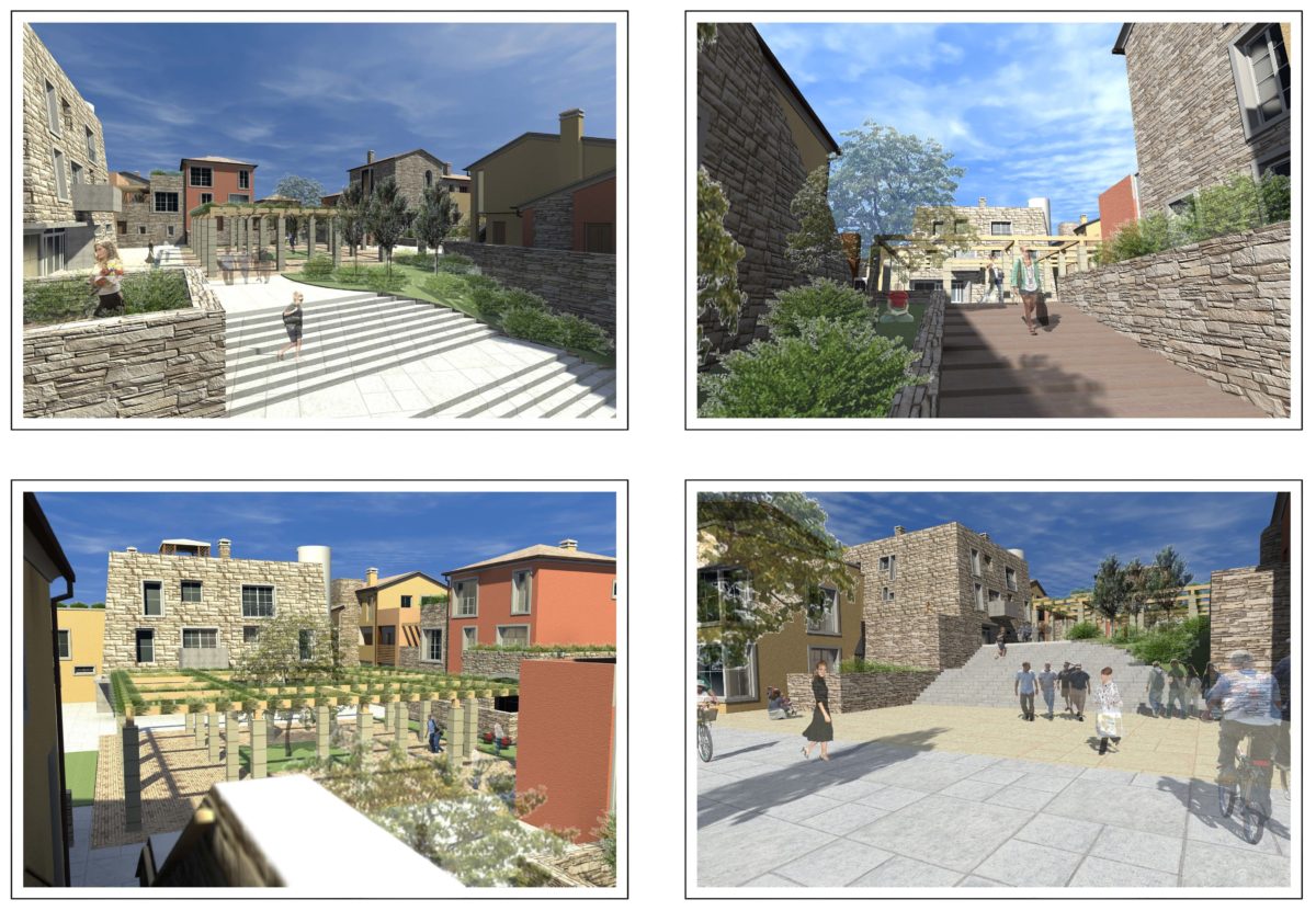 Analogamente la tipologia edilizia degli edifici residenziali, così come quella della altre funzioni previste (edifici commerciali, spazi comuni e per il divertimento, un luogo di culto e parcheggi) evoca forme e dimensioni degli storici borghi italiani, sebbene con digressioni moderniste per diversificare ed attualizzare il linguaggio.