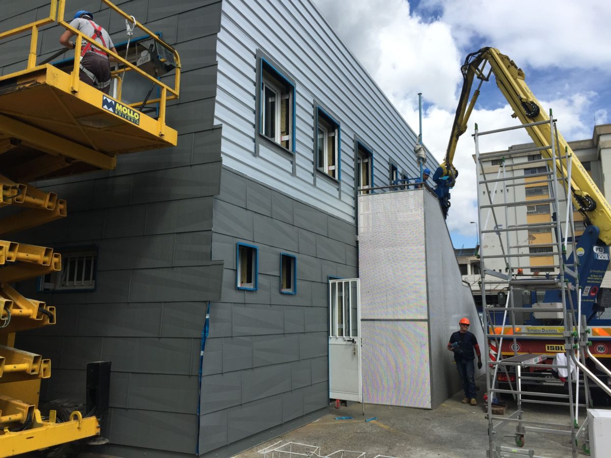 Il progetto prevede la totale modifica di un manufatto temporaneo esistente tramite la riprogettazione completa dell’esterno con un rivestimento in facciata ventilata. La finitura è prevista in scandole di alluminio preverniciato modulari leggermente sovrapposte sul profilo orizzontale.